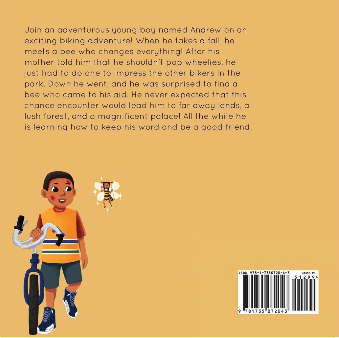 Join an adventurous young boy named Andrew on an exciting biking adventure! When he takes a fall, he meets a bee who changes everything! After his mother told him that he shouldn’t pop wheelies, he just had to do one to impress the other bikers in the park. Down he went, and he was surprised to find a bee who came to his aid. He never expected that this chance encounter would lead him to far away lands, a lush forest, and a magnificent palace! All the while, he is learning how to keep his word and be a good friend.